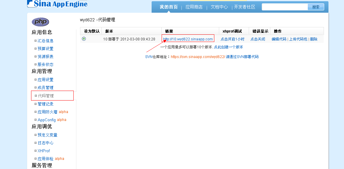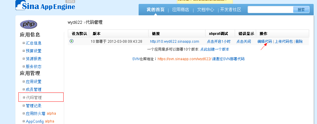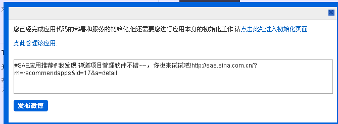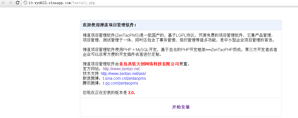 把应用和版本创建好后,就可以进行安装了。禅道已经被新浪SAE选为默认应用,因此可以直接通过SAE的应用商店来安装禅道。下面我们来看如何通过应用商店来安装禅道。