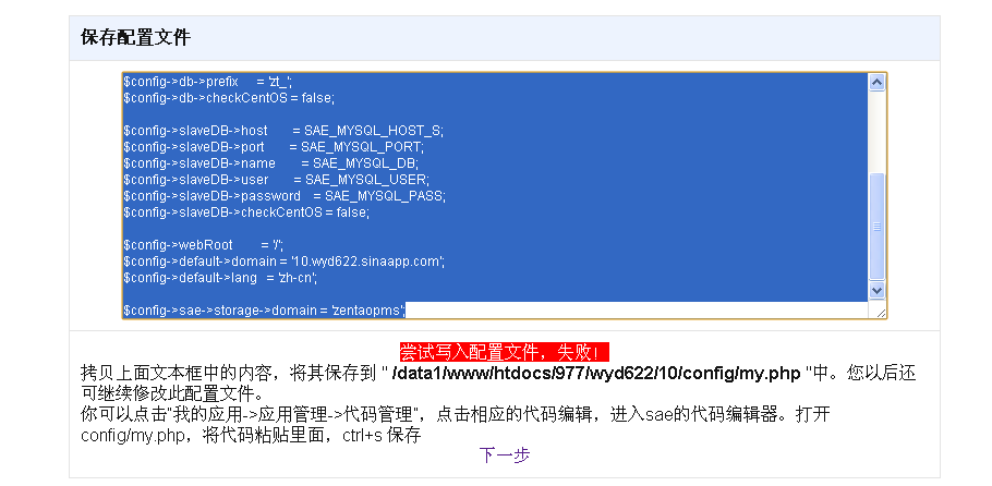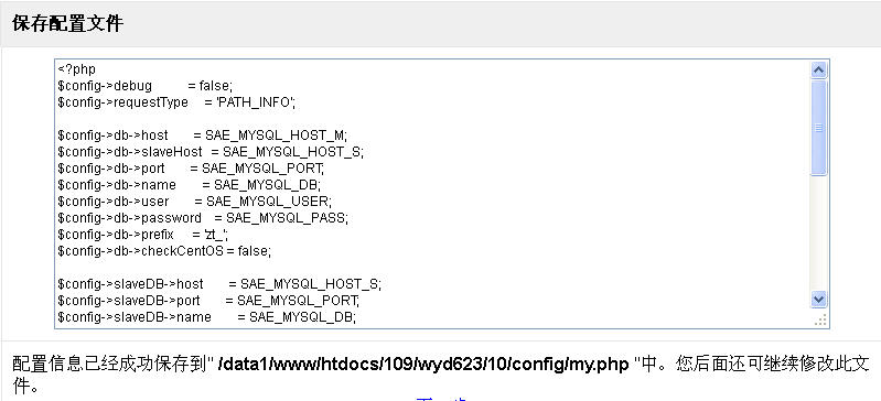 保存配置文件,将文本域的内容全选复制,保存到config的my.php文件里面。