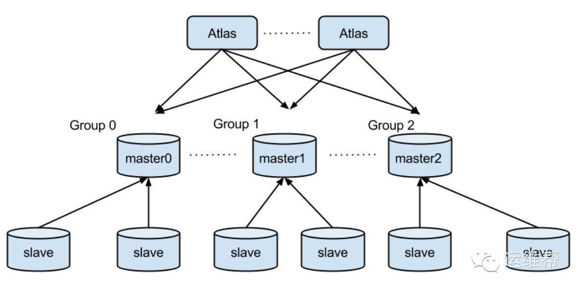 在Atlas中, 将一个组看做是数据存储的单位, 一个组由一台master, 零台或者多台slave组成(mysql主从同步需要由用户自己配置). 每个组之间的数据独立, 没有关系, 表的数据的各个部分存储在各个组中.
